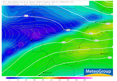 Vientos a 300hPa. Nos va a ayudar a ver los flujos de viento en esa altura y el desplazamiento de las posibles tormentas que pudiera haber, como podremos comprobar será un viento predominante del Oeste-Suroeste.