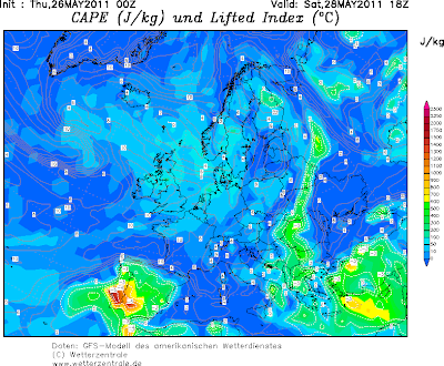 Durante este día, aunque las precipitaciones que marca el GFS no son demasiado mportantes, si que habría que especificar que en donde se produzcan tormentas, que puede ser en zonas del oeste y en puntos de montaña, podrían ser localmente fuertes, especialmente en Portugal y puntos limítrofes de España. Y es que como ahora veremos a continuación, los índices de inestabilidad seran muy elevados.